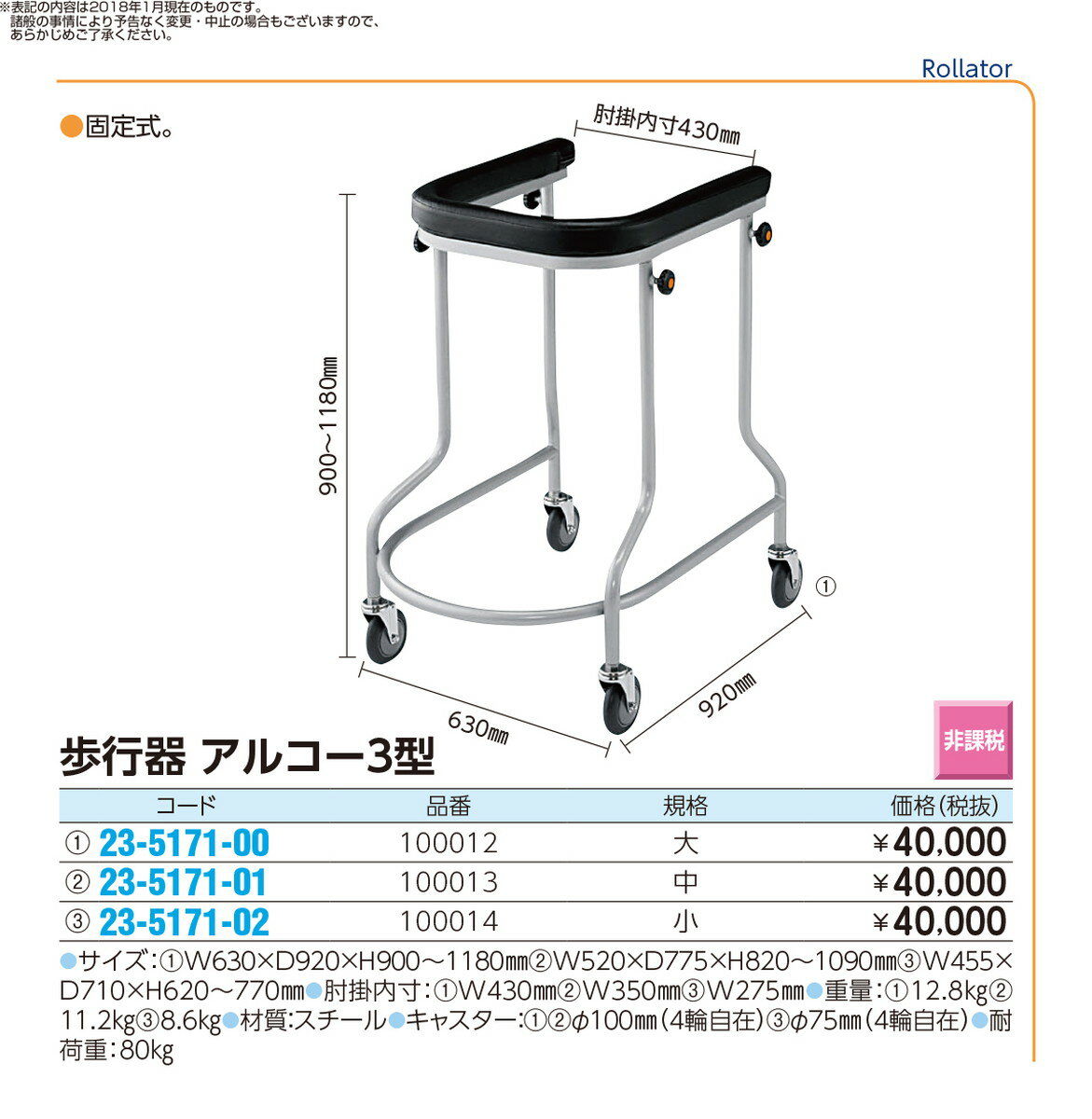 歩行器 アルコー3型(中) 100013品番 23-5171-011入り 医療機器対象外 整形・リハビリ 歩行器・松葉杖 定価\40000 JAN 4537711000136 ●定価¥40,000円(税別)●商品説明●固定式。