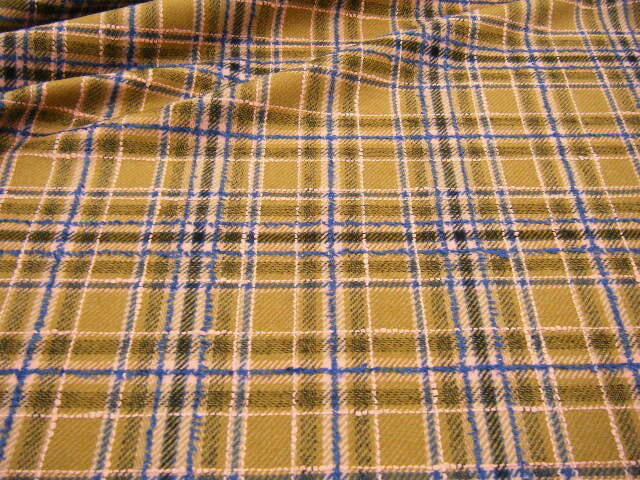 安心の日本製 上質 薄手 カシミア ウール チェック柄 ファンシー 綾ツイード生地 こちらの生地は1mあたりの お値段となっております オーカー色(濃いキャメル系)地にピンクと群青系の糸でファンシー格子となった素敵な綾ツイード生地です 生地の厚みは『 普通厚 』で扱いやすいです カシミヤが入っているので、 ほんのりなめらかな手触りです 素材的にはケープ・マント・コート・ハーフコート・ジャケット等の羽織りものやチュニック・ワンピースにも オススメです。